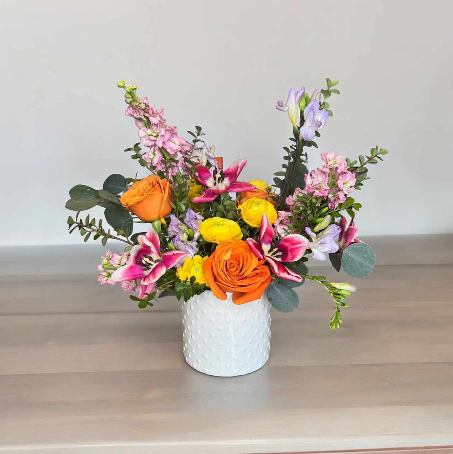 Embrace the beauty and affordability of our Garden Arrangement, uniquely handcrafted by our expert floral designer. Embrace the florist’s choice, as the selection of flowers and the style of the arrangement will vary, reflecting the best of what’s in season. Perfect for any occasion, each arrangement promises a delightful and unique experience.